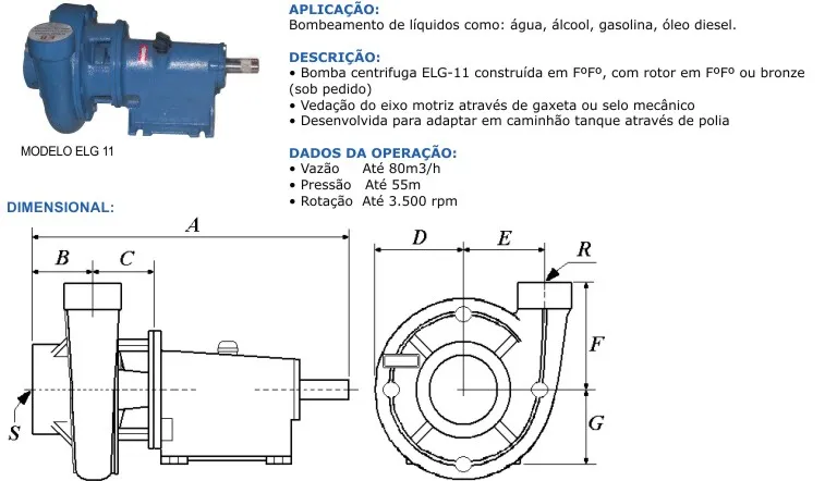 - Bomba centrifuga ELG-11 construída em F°F°, com rotor em F0F0 ou bronze (sob pedido)